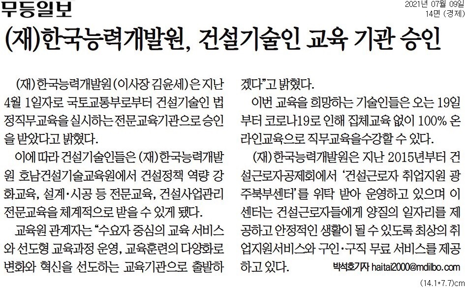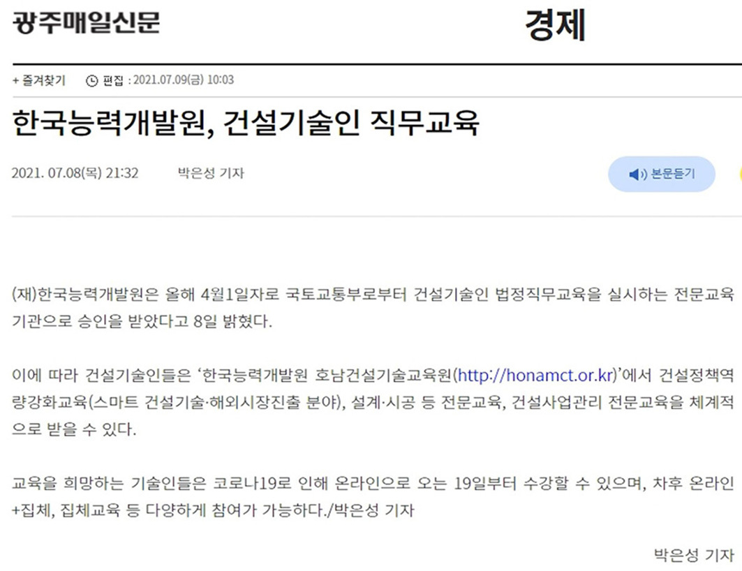 | 건설기술인 법정직무교육 전문교육기관 승인 - (재)한국능력개발원 호남건설기술교육원 | 최고관리자 / 2021.07.09 | |