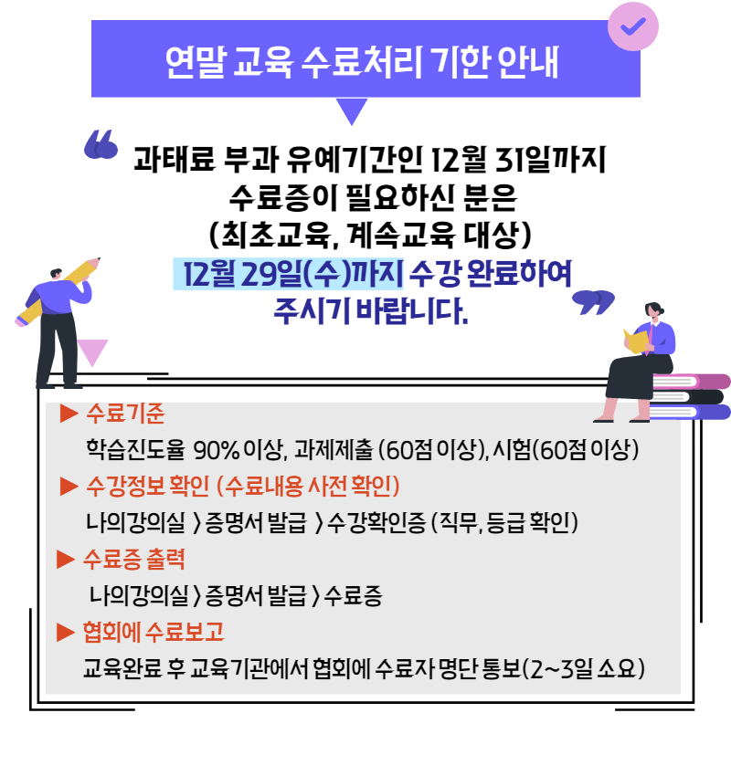 | 연말 교육 수료처리 기한 안내 (12/29까지 수강 완료) | 최고관리자 / 2021.12.22 | |