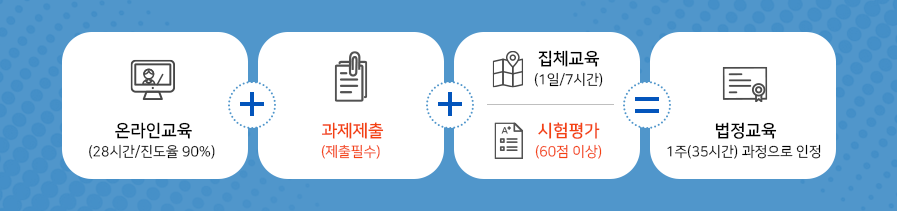 온라인교육(28시간) + 과제제출 + 시험(60점이상) + 집체교육(7시간 참석)