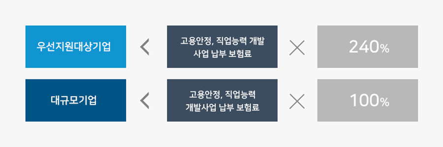 사업주가 ‘보험료 징수법’에 따라 부담하는 해당 연도 고용안정ㆍ직업능력개발사업 보험료의 100% (우선지원대상기업은 240% 지원)